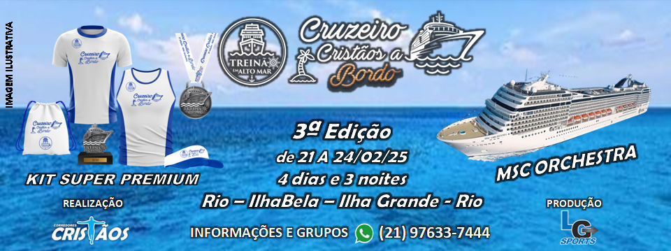 O 3° TREINÃO EM ALTO MAR - CRUZEIRO CRISTÃOS A BORDO é uma iniciativa dos Corredores Cristãos para promover uma confraternização com amigos, clientes e parceiros. O evento acontecerá de 21/02/2025 a 24/02/2025 a bordo do MSC ORCHESTRA. Todos são bem-vindos, independentemente de religião.