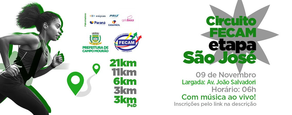 Prepare-se para mais uma grande celebração do esporte e da superação pessoal! 🏃 A 5ª Etapa do Circuito de Corridas FECAM chega à cidade de Campo Mourão com a Etapa São José, reunindo atletas de todas as idades, categorias e níveis de experiência. ✨ Venha correr com a gente e fazer parte desse evento que vai movimentar a cidade!