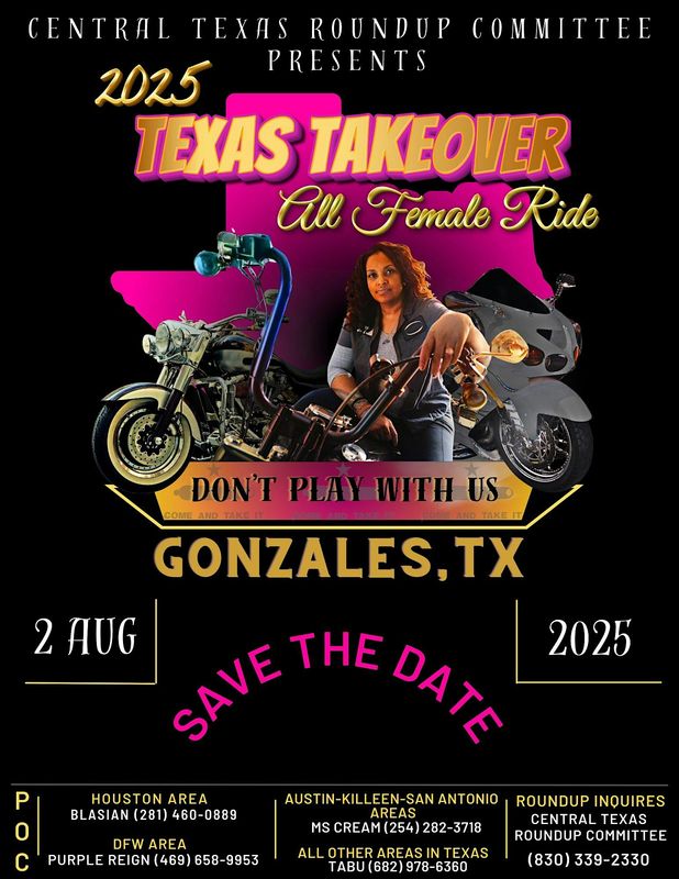 Get ready for the ultimate Central Texas Roundup All Female Ride in Gonzales, Texas! The event lasts 6 hours and focuses on connecting women who share a passion for motorcycling. It will take place during the 48th National Bikers Roundup® from July 29, 2025, to August 3, 2025. Events for paid participants are scheduled for Wednesday, July 30; Friday, August 1; and the main ALL FEMALE RIDE on Saturday, August 2. Mark your calendars and prepare to hit the road with other phenomenal women. Whether you're an experienced rider or new to the scene, this event is perfect for everyone. ### Event Details: - **Date:** August 2, 2025 - **Location:** J.B. Wells Arena, 2301 County Road 197, Gonzales, TX 78629 - **Start Time:** 08:00 AM - **End Time:** 02:00 PM For more information and to register, visit: [National Bikers Roundup](https://www.nationalbikersroundup.org/) or [Eventbrite](https://www.eventbrite.com/e/central-texas-roundup-committee-all-female-ride-2025-tickets-1077096407349).