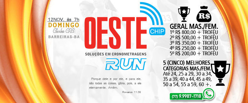 A Corrida da OESTE CHIP (OESTE CHIP RUN) será para consolidar a empresa que é pioneira em soluções em cronometragem no Oeste Baiano. Com o intuito de comemorar e agradecer, estará realizando a 2ª edição, valorizando os atletas e contribuindo na promoção da saúde física, mental e na prevenção de doenças, consolidando o evento no calendário desportivo local e regional.