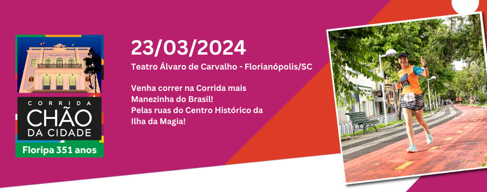 Venha correr na prova mais manezinha do Brasil, pelas ruas e prédios históricos da belíssima cidade de Florianópolis, nosso querida Floripa! E aproveite um fim de semana na Ilha da Magia e desfrute de um percurso desafiador no berço de Floripa, ainda aproveite para curtir as belezas naturais e as atrações da cidade. Fórmula perfeita: Corrida + Curtir Floripa! Poderão inscrever-se na Corrida Chão da Cidade homens e mulheres, maiores de 16 (dezesseis) anos de idade, para as categorias premiação de 5 (cinco) quilômetros e de 10 (dez) quilômetros e na categoria de participação para a caminhada guiada por guia de turismo. As inscrições estarão disponíveis durante o período de 01 de novembro de 2023 a 01 de março de 2024, ou até atingir o limite técnico total de 1000 (mil) inscritos. O valor das inscrições, respeitado o período de cada lote vigente, será: PRÉ-VENDA – de 01 a 31 de novembro de 2023, ou até atingir o número limite de inscritos 60 – R$ 69,00 (sessenta e nove reais); 1º Lote – de 31 de novembro a 31 de dezembro de 2023, ou atingir o número limite de inscritos – R$79,00 (Setenta e nove reais). 2º Lote – de 01 de janeiro de 2024 a 01 de março de 2024, ou atingir o número limite de inscritos – R$99,00 (Noventa e nove reais). Inscrições até 19/03/24 23:59.