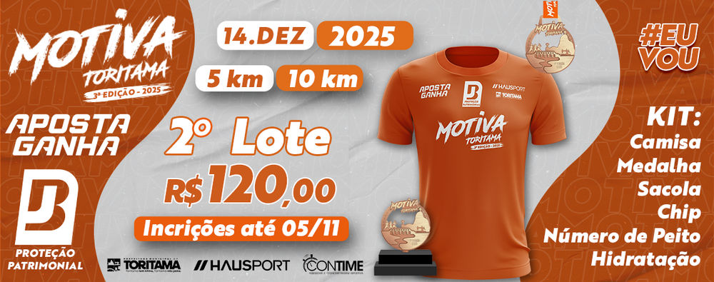 A prova Motiva Toritama 2025 acontece no dia 14 de dezembro, na cidade de Toritama – PE. Terá percursos de 5 km e 10 km, com largada às 07h00. O evento reúne atletas de diferentes categorias e idades, incentivando o esporte, a saúde e a integração da comunidade!