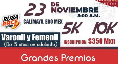 La Carrera Ruba Race 2025 se llevará a cabo el 23 de noviembre de 2025 en Fracc. Hacienda de las Fuentes, Calimaya, Estado de México. Las distancias disponibles son 5k y 10k.