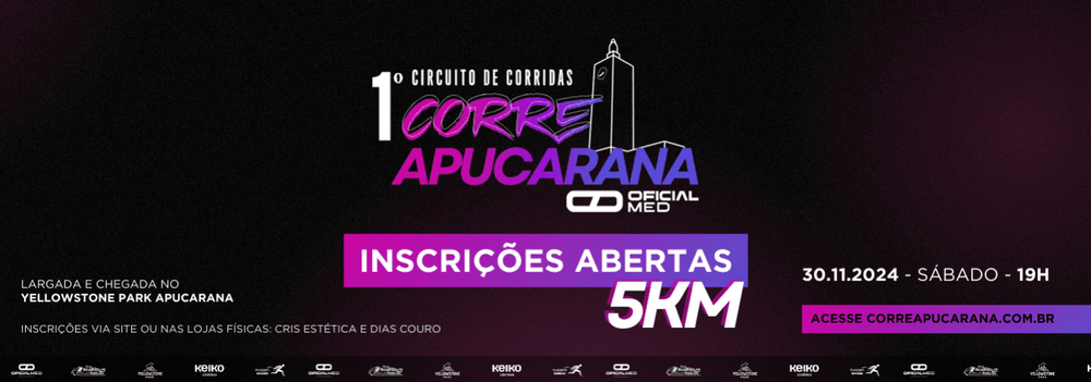 Venha participar da Corrida 1 Corre Apucarana, que acontecerá no dia 30 de novembro de 2024, com largada às 19h00. O evento será realizado na Rua Dr. Oswaldo Cruz, 1420, de frente ao Parque Gastronômico YellowStone Park.