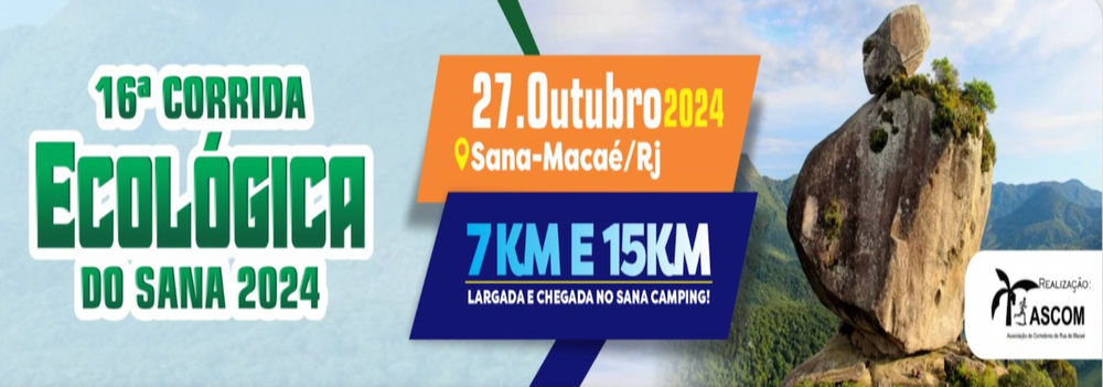 16 Corrida Ecologica do Sana 2024 é um evento de corrida e caminhada que acontecerá no Sana Camping, em Macaé, RJ. As distâncias incluem 3 KM de caminhada, 7 KM e 15 KM de corrida, além de percursos para crianças de 50m a 400m. Venha participar e se divertir em contato com a natureza!