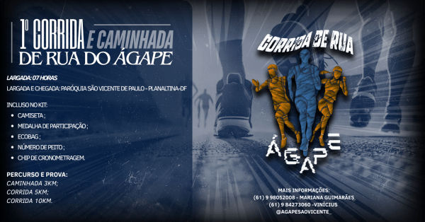 A 1ª Corrida de Rua Ágape é uma atividade esportiva organizada pelo grupo Ágape São Vicente. O evento tem como finalidade promover saúde, bem-estar e lazer, além de arrecadar fundos para a evangelização de jovens da comunidade.