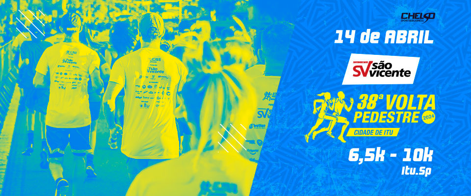 A São Vicente 38º Volta Pedestre de Itu, acontece dia 14 de Abril e possui as distâncias de 6,5k e 10k e você não pode perder a chance de garantir a sua medalha na cidade dos exageros! Inscreva-se agora mesmo e se supere!! - Distâncias de 6,5km e 10km para escolher; - Percursos 100% asfalto pela Av. Galileu Bicudo; - Hidratação durante a prova; - Organização Chelso Sports; - Premiação geral até o 5° Lugar e premiação por categoria de10 em 10 anos até o 3° Lugar; - Pós prova recheado com patrocínio da São Vicente; - Kit exclusivo da edição; - Uma nova conquista marcada por fortes emoções e uma mealha IRADA; Chama a galera, faça sua inscrição e venha fazer história na São Vicente 38° Volta Pedestre de ITU Programação PROGRAMAÇÃO DA PROVA: Data: 14/04/2024 Horários: - Concentração: 6h00 - Largada 6,5Km e 10km: 7h00 Local: Av. Galileu Bicudo Distâncias: Corridas de 6,5km e 10km. Kit Atleta KIT INCENTIVE - MEDALHA FINISHER + NUMERAL E CHIP + PÓS PROVAKIT PLUS - MEDALHA + NUMERAL E CHIP + PÓS PROVA + CAMISETAKIT PREMIUM - MEDALHA + NUMERAL E CHIP + PÓS PROVA + CAMISETA + MALA Regulamento Regulamento Volta Pedestre de Itu - 2024.pdf PERCURSOS Inscrições até 12/04/24 23:59. INSCREVA-SE Em até 10x no cartão ORGANIZADOR Chelso Sports Fale com o organizador COMPARTILHE ESTE EVENTO JÁ FEZ SEU PEDIDO? 2ª via de boleto Protocolo de inscrição Acesse a Área do Participante Dúvidas sobre a inscrição Fale conosco Denunciar evento KIT PREMIUM NUMERO DE PEITO - MEDALHA - CAMISETA - MALA (RUN FOR) + KIT PLUS NUMERO DE PEITO - MEDALHA - CAMISETA + KIT INCENTIVE NUMERO DE PEITO - MEDALHA Corrida 10kmde R$ 174,90 por R$ 139,90 + R$ 10,69 taxa de serviçodesconto de idoso sobre lote cheio Escolher Corrida 6,5kmde R$ 174,90 por R$ 139,90 + R$ 10,69 taxa de serviçodesconto de idoso sobre lote cheio Escolher Caminhada 6,5kmde R$ 174,90 por R$ 139,90 + R$ 10,69 taxa de serviçodesconto de idoso sobre lote cheio Escolher Corrida 10kmde R$ 134,90 por R$ 99,90 + R$ 8,49 taxa de serviçodesconto de idoso sobre lote cheio Escolher Corrida 6,5kmde R$ 134,90 por R$ 99,90 + R$ 8,49 taxa de serviçodesconto de idoso sobre lote cheio Escolher Caminhada 6,5kmde R$ 134,90 por R$ 99,90 + R$ 8,49 taxa de serviçodesconto de idoso sobre lote cheio Escolher Corrida 10kmde R$ 104,90 por R$ 69,90 + R$ 6,84 taxa de serviçodesconto de idoso sobre lote cheio Escolher Corrida 6,5kmde R$ 104,90 por R$ 69,90 + R$ 6,84 taxa de serviçodesconto de idoso sobre lote cheio Escolher Caminhada 6,5kmde R$ 104,90 por R$ 69,90 + R$ 6,84 taxa de serviçodesconto de idoso sobre lote cheio Escolher